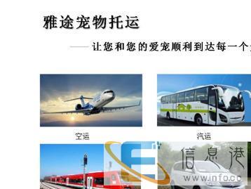雅途宠物托运承接宠物单独空运、宠物随主人一起随机托运、宠物汽车托运,宠物火车托运等一切宠物中转托运业务,无需你本人来济南,你可以什么都不用准备,一切交给我们来搞定!我们的员工对待宠物有足够的爱心与耐心,经过多年的宠物托运经验积累,具备较高的宠物托运专业知识,能针对不同品种的宠物,能根据它们不同的习性,脾气特点,制定相应的运输方式,操作细节,与注意事项。宠爸宠妈在托运前都需要准备哪些东西?需要准备哪些东西?短途准备一两餐粮食即可,出发前会有工作人员喂养;天热了,给宠物准备个水壶(自动饮水器),夏天给宠物准备冰袋或者冰晶进行物理降温;胆小的宠物,可以给它准备些熟悉的物品在笼子里,比如主人的旧衣物、玩具等哪些宠物不适合托运?1.有传染性疾病的宠物;2.有心脏病、血丝虫病的;3.有呼吸系统疾病的,如:肺气肿、肺心病等,因不适应环境,如果有气闷、肺大泡等,飞行途中可能因气体膨胀而加重病情;4.有耳鼻喉的,耳鼻有急性渗出性炎症,及近期做过中耳手术的宠物,不宜空中旅行;5.有严重贫血的;6.怀孕超过一个月的宠物;7.做过胃肠手术的宠物,一般在手术10天内不能乘坐飞机,消化道出血的宠物要在出血停止三周后才能乘坐飞机温馨提示:所有空运、汽运、火车的目的地提货费收货人自付; (空运,火车,汽运)都有可能存在非人为因素的影响导致各种情况发生(例如航空管制,飞机晚点,取消,天气原因,堵车,交通事故各种各样的不可控因素,如果发生这样的情况客服会**时间跟客户沟通,重新制定出行方案)购买了保险服务的,按照保额赔偿,没有购买的按照机场汽车站火车站制度规定执行,本店不负连带责任.(跟客户沟通好的**出行方案,时间,有可能存在以上各种各样的情况延误,,本店不对这因素造成的延误做出保证,赔偿,如果太在意这些的客户请您注意。下单前请阅读))本店只运输宠物,买家可以准备行程所需宠物口粮(不运输宠物的各种各样的生活用品玩具等,请买家注意)